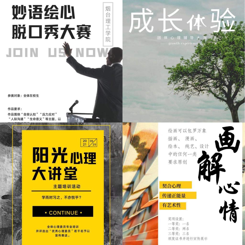 为全面落实全国、全省教育大会精神,扎实做好常态化疫情防控形势下的心理健康教育工作,培育学生自尊自信、理性平和、积极向上的健康心态,根据《山东省教育厅关于举办2021年山东省学校心理健康教育月活动的通知》(鲁教思函〔2021〕6号)的要求,我校于2021年5月份以“多彩校园 健康心态 蓬勃人生”为主题,以发展性心理健康教育和积极心理学理念为主导,结合常态化疫情防控形势,广泛开展烟台理工学院心理健康教育月系列活动。