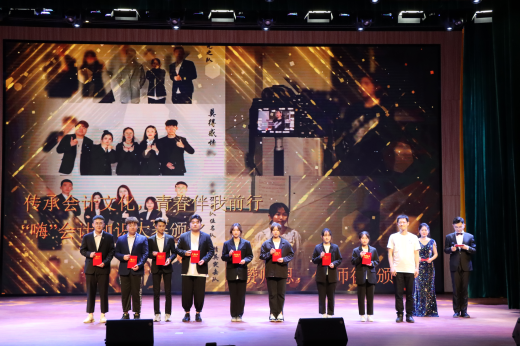 晚会进行过程中,老师们为“嗨”会计知识竞赛和赞师恩颂师德视频拍摄活动、“我与书的约定”读书打卡比赛、“十里春风,不如会计有你”征文比赛中表现优异的团队及个人进行颁奖。