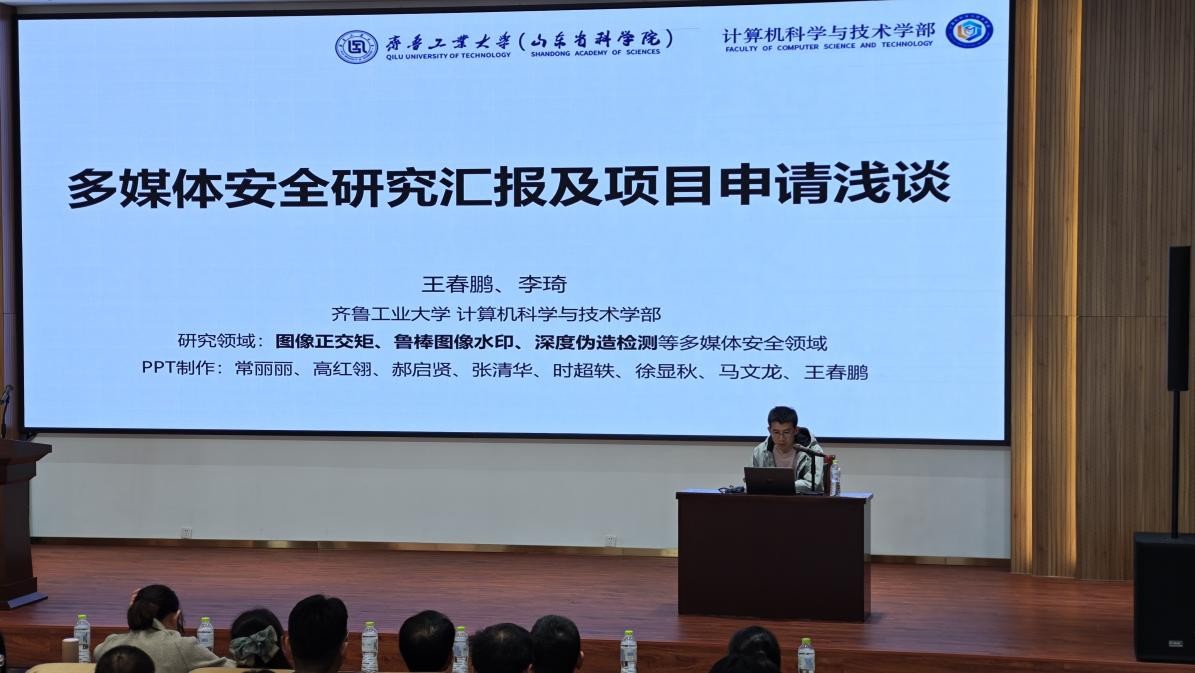 在汇报过程中,王春鹏博士紧密围绕“多媒体安全领域研究进展”与“国家(省级)科研项目申请要点”两大核心板块展开深入分享。其中,“多媒体安全领域研究进展”板块紧扣当前网络空间安全需求与学术前沿方向,融入其团队在图像特征提取、数字水印优化、深度伪造检测等方向的实测数据与创新成果;“国家(省级)科研项目申请要点”板块则基于其多次成功获批基金项目的实战经验,不仅系统解读领域内技术发展动态与科研选题方向,更针对申报中易忽略的逻辑梳理、材料打磨等关键环节拆解核心思路,为在场全体教师及学生提供兼具理论深度与实践指导性的专业解读,助力其更加清晰地把握科研与申报的内在关联。