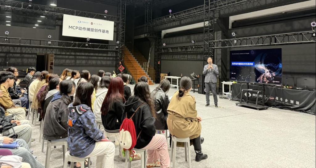实践环节成为同学们从认知走向实操的“技能练兵场”。在动捕导师与本校专业教师的联合指导下,学生分组穿戴专业动捕服装,进入标准化光学动捕实验室。随着影视级相机精准捕捉人体运动轨迹,屏幕中的虚拟角色实时复现连贯动作,生动演绎“真实动作数字化—数字信号虚拟化”的全流程,也让同学们亲身体验到综合能力在内容创作中的关键作用。